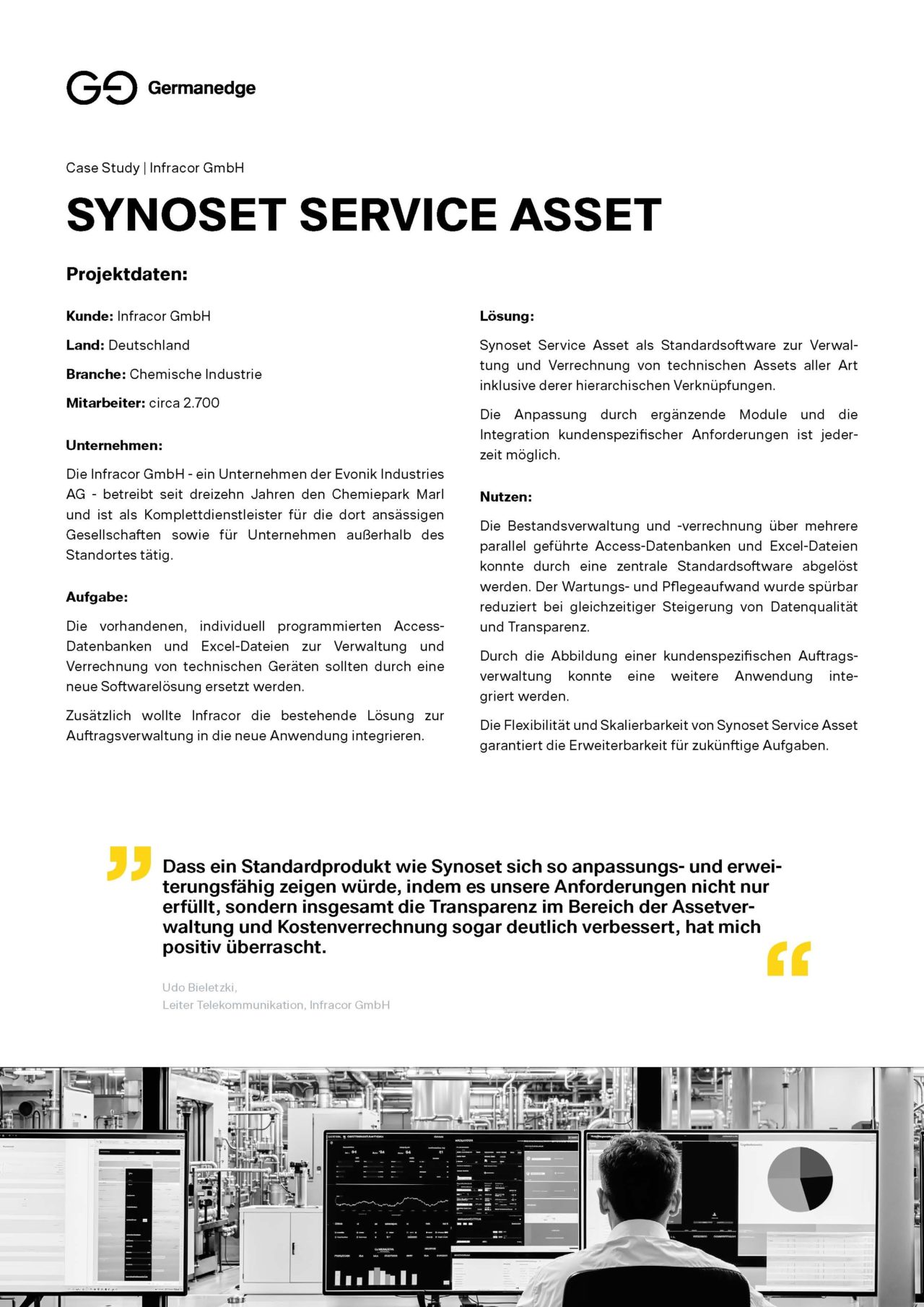 „Dass ein Standardprodukt wie Synoset sich als so anpassungs- und erweiterungsfähig zeigen würde, hat mich positiv überrascht. Es hat unsere Anforderungen nicht nur erfüllt, sondern die Transparenz im Bereich Asset-Verwaltung und Kostenverrechnung sogar deutlich verbessert“.